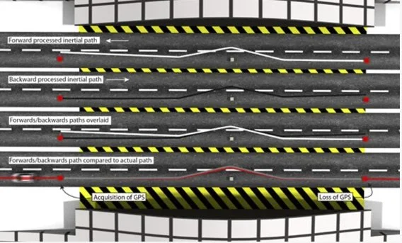 In areas where GNSS signal is lost and then reacquired, inertial data can be processed backwards from the reacquisition of signal and combined with the same data processed forwards from the loss of signal to reduce IMU drift.